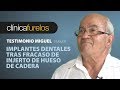 Tras un complicado injerto de cadera, realizado en otra Clínica, a Miguel le fueron colocados varios implantes dentales que perdió en pocas semanas. Con muy poco hueso, no le ofrecían ninguna alternativa. Acude entonces a ClínicaFurelos y encontró una sencilla y duradera solución. Pudo restaurarse su hueso mediante injertos de hueso sencillos, de hueso en polvo. Desde hace varios años tiene perfectamente integrados 8 implantes dentales, que soportan una dentadura fija.